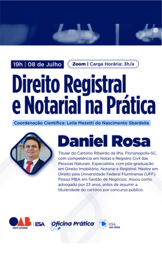 é Tabelião e Registrador Civil da Escrivania de Paz do Distrito do Ribeirão da Ilha, em Florianópolis/SC.
